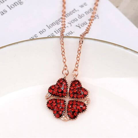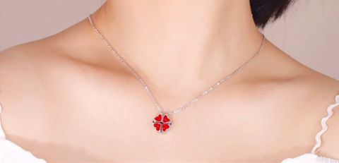 Modello con calamita che consente alla collana di trasformarsi da serie cuoricini in un quadrifoglio.